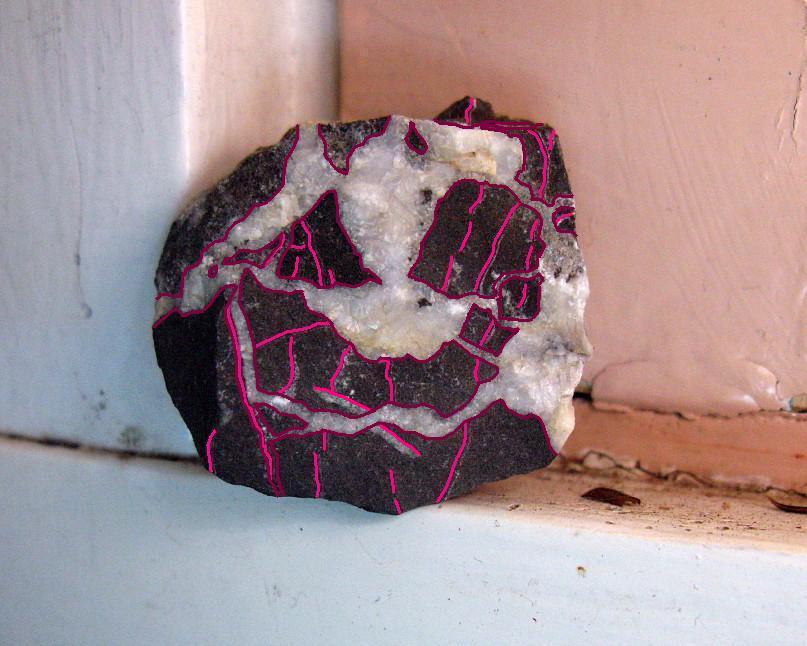 MOH brough this little gem home from a hike one day, and it was immediately in the running for top shelfcrop, seeing as how Halloween is nearly upon us and it resembles an cheerfully smiling jack-o-lantern. It has a big grin, one partly squared off round eye, and one triangular eye. In reality, it's a dark gray, brecciated dolomite (now running out to the truck to get the HCl in order to test this diagnosis - yes!). Some breccia clasts appear to have been rotated or at least moved (the triangular eye) while others appear to be nearly in place (part, or even most, of the smile); the clasts were then cemented by a matrix of white, coarsely crystalline